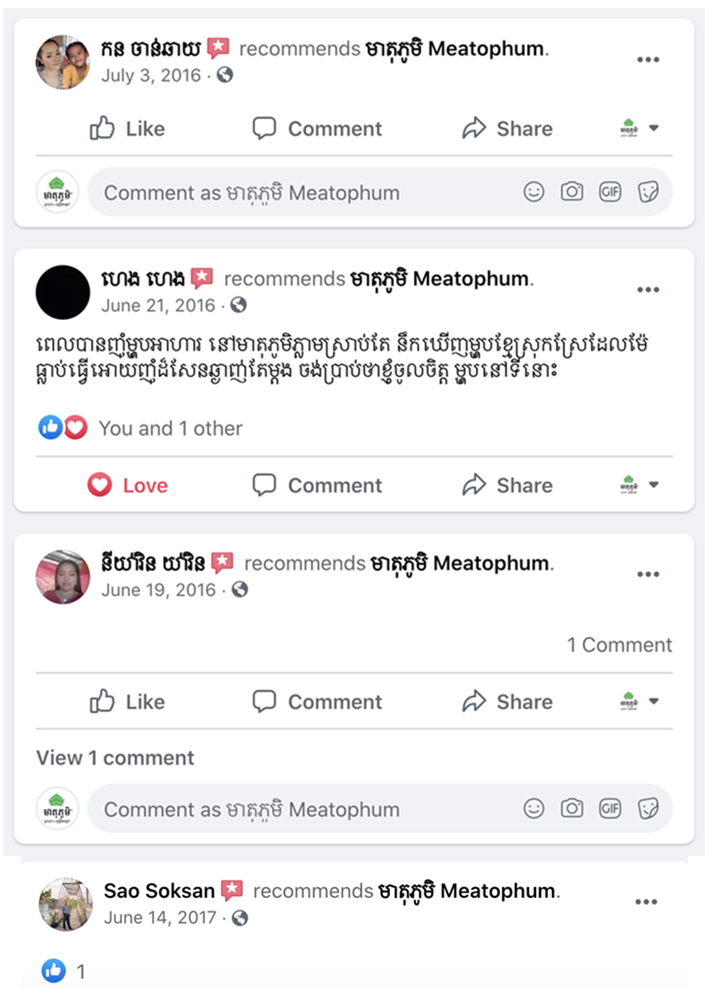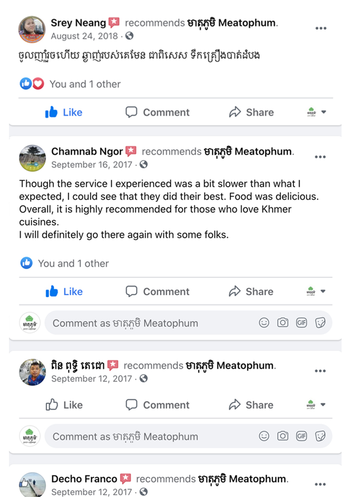 យើងចូលចិត្តស្តាប់យោបល់របស់អតិថិជនដែលបានមកកាន់ភោជនីយដ្ឋានយើង និងបកស្រាយពីអារម្មណ៍មុខម្ហូបនីមួយៗ។